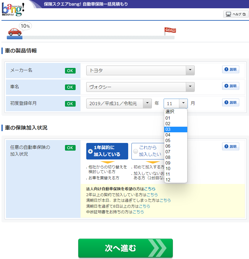 画面の案内に従って、いま乗っている車の情報、いま契約している自動車保険の内容、補償内容・オプション(車両保険など)、個人情報を入力します。